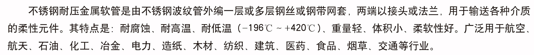 由于制作软管主要零件的材料是采用奥氏体不锈钢,因而保证了软管优良的耐温性和耐蚀性,软管的工作温度范围广,使用的软管按管道所通介质的腐蚀性选择适用的不锈钢牌号,即可保证软管的耐蚀性。