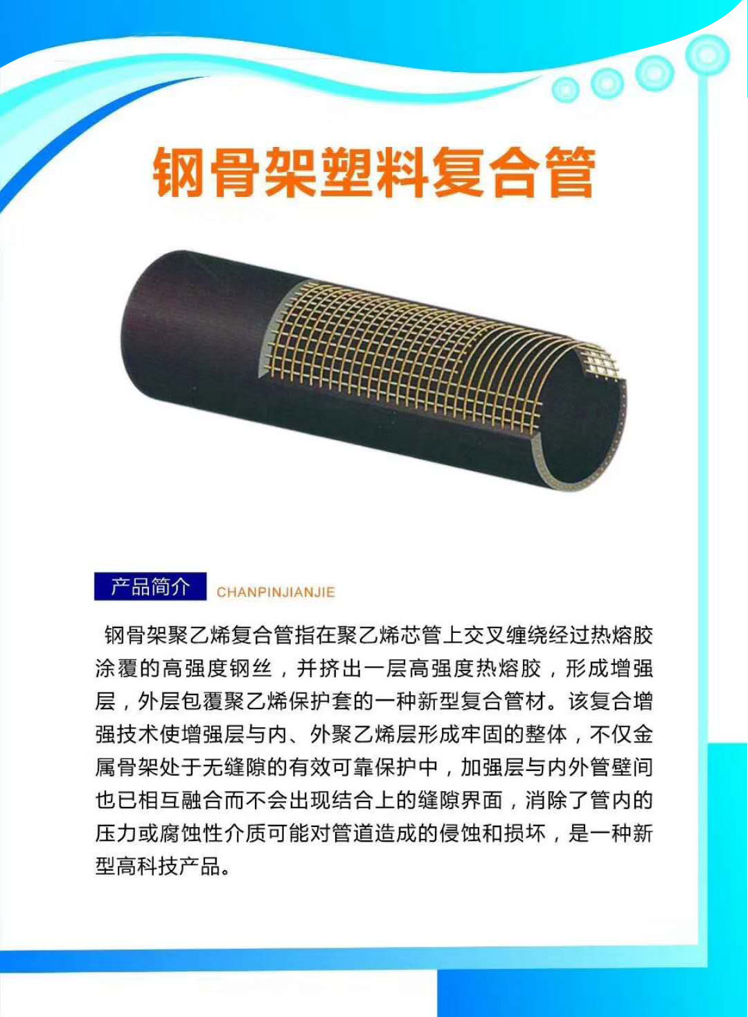 产品名称:钢骨架塑料复合管 产品类别:PSP钢塑管系列>>钢骨架塑料复合管 咨询电话: 022-83702977 技术参数: 可定制